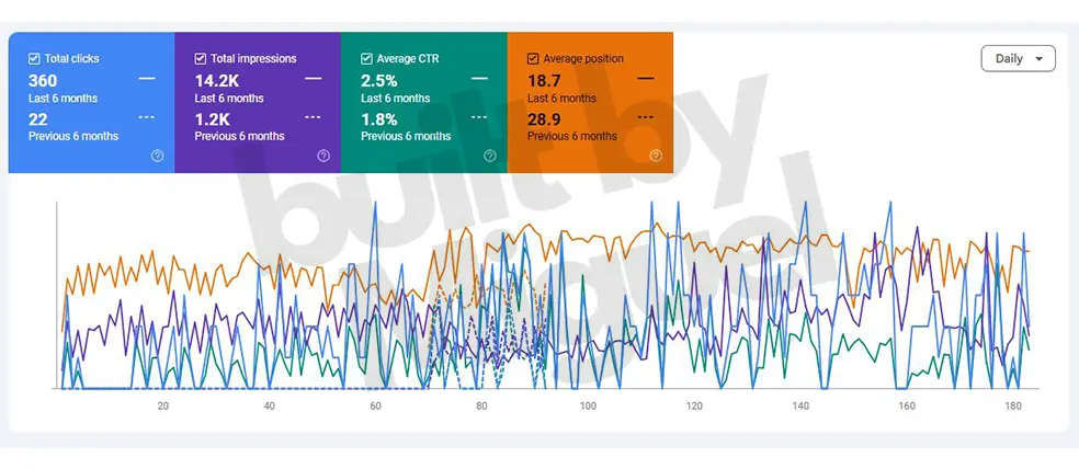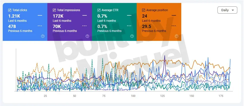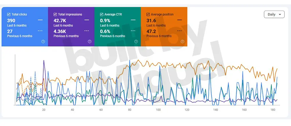 - The Result: +1,344% increase in organic clicks. This led to 42.7K search impressions. Visibility grew by 10x.